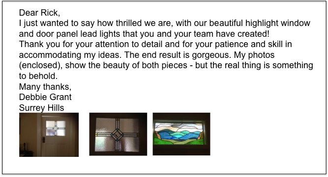 Thanks for totally transforming our home. The leadlighting has made a world of difference.
